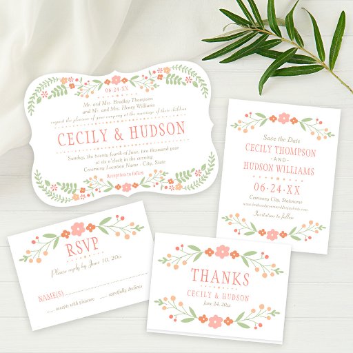 Rustic chic wedding invitations feature a symmetrical floral frame of pretty peach, blush pink, coral, and nectarine orange flowers and soft green botanical leaves with hand-drawn look that frame the design, and background with a subtle and elegant woven textured appearance.