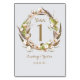 Elegant rustic wedding table cards features watercolor cotton floral wreath and pheasant feathers on a light grey background.