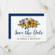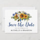 Watercolor boho navy & yellow save the date cards featuring a classic white background that can be changed to any colour, a rustic sunflower floral display, feathers, and a wedding save the date template.
