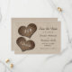 Rustic country wedding save the date photo cards featuring two burlap hearts on a light burlap background.