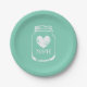Mint green paper party plates with wedding monogram. Customisable colour and personalise name initial letters of bride and groom. Elegant typography in rustic country chic mason jar design. Cute romantic design with vintage heart icon. Faded weathered love symbol. Disposable plates for wedding, bridal shower, engagement, anniversary or bachelorette party. Customisable background colour. Perfect for outdoor barn wedding in summer around july, august, september.
