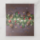 Rustic christmas winter party place cards featuring a dark wooden background, festive christmas tree branches, red & gold tree decorations and string twinkle lights.