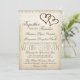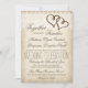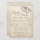 Unique Rustic Country Typography Wedding Invitations with two intertwined hearts in the upper corner on a distressed antique paper background design with a printed white lace design at the top. The same double heart and vintage paper design is also on the backside, except the hearts are in the lower corner. The font typeface is a cute combination of fonts for a typography style look. These are great for rustic country and western weddings.