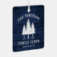 Personalise your country home with a beautiful rustic themed 2 sided metal ornament, featuring your name and "Family Cabin", Ranch, Cottage or other text along with its established date and location if desired. This custom, unique design features rustic country style text with a white silhouette of pine trees on a print of wood planks in rich blue colours. A charming addition to your vacation home, holiday christmas tree decor. To see more designs like this, feel free to visit my store here at "Zazzle.com/Rustic_Charm". Thanks.