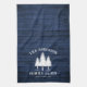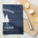 Personalise your country home with beautiful rustic themed kitchen and bar towels, featuring your name and "Family Cabin", Ranch, Cottage or other text along with its established date and location if desired. This custom, unique design features rustic country style text with a white silhouette of pine trees on a print of wood planks in rich blue colours. To see more designs like this, feel free to visit my store here at "Zazzle.com/Rustic_Charm". Thanks.