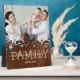 Personalised rustic photo plaque for the home featuring a precious family photo, a dark wooden heart design, the word "FAMILY", your name in an elegant script font, and the date.