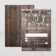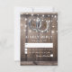 Country chic wedding response cards featuring a rustic wood barn background, a pair of horseshoes, string twinkle lights and a modern rsvp template.