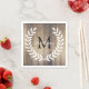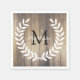 Rustic paper cocktail napkins perfect for a home bar featuring a white country laurels silhouette over light barn wooden planks and your personalised monogram texts. These napkins are the number one choice for a rustic wedding! Grace your guests tables with these country chic farmhouse napkins.