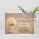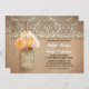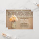 Cute rustic wedding invitation featuring mason jar with peach orange hydrangea blossom. Perfect invite for country wedding with vintage lace and distressed wood accents.