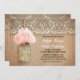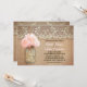 Cute rustic wedding invitation featuring mason jar with pink hydrangea blossom. Perfect invite for country wedding with vintage lace and distressed wood accents.