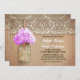 Cute rustic wedding invitation featuring mason jar with light purple hydrangea blossom. Perfect invite for country wedding with vintage lace and distressed wood accents.