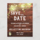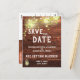 Rustic country wedding wood mason jar string of lights tree branch with green leaves Save the Date postcard. The glowing string of lights illuminate the green leaves against a beautiful rustic dark brown wood. This rustic wedding design is customisable and perfect for your beautiful outdoor country wedding or western wedding.