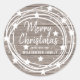 A modern abstract white grapevine wreath with stars overlays a light wood plank pattern. Merry Christmas is written in the centre in a popular font with your name below. Tiny dots also give it visual depth and interest.