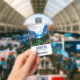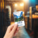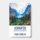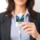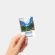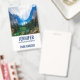 Name tag with a beautiful photograph of a pleasant and tranquil nature scene. Vibrant green forest in the front and shadowy blue mountains in the back. With a dreamy cloudy white sky. Misty and magical feel. Perfect for outdoors professions.