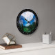 A clock with a beautiful photograph of a pleasant and tranquil nature scene. Vibrant green forest in the front and shadowy blue mountains in the back. With a dreamy cloudy white sky. Misty and magical feel.