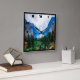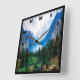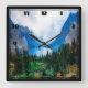 A square clock with a beautiful photograph of a pleasant and tranquil nature scene. Vibrant green forest in the front and shadowy blue mountains in the back. With a dreamy cloudy white sky. Misty and magical feel.