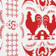 Red and white country rustic decor pattern featuring back to back roosters and a barn with additional floral style (floralia) details by Holiday Hearts Designs.