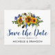 Watercolor boho navy & yellow save the date cards featuring a classic white background that can be changed to any colour, a sunflower floral display, feathers, and a modern save the date template.