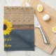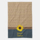 Rustic country or cottage chic simulated faux burlap, lace, dark blue denim and yellow sunflower flower kitchen towel.