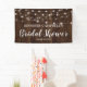 Country chic bridal shower banner featuring a rustic barn wood background, string twinkle lights and a bridal party text template. Click on the “Customise it” button for further personalisation of this template. You will be able to modify all text, including the style, colours, and sizes. This is perfect for a rustic, country, western, ranch, barn, vineyard or backyard wedding bridal shower.