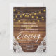 Elegant, chic, and rustic country hanging string lantern lights and white lace on wood planks, evening wedding reception invitations. This classic and sophisticated design is perfect for the trendy and stylish marrying couple. Personalise with your own message on the front as well as a customised monogram initial on the back. All photo print design.