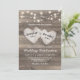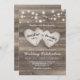 Rustic country wedding invitations featuring a wood barn textured background, string lights, and two carved love hearts with the couples names.