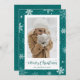 Custom teal rustic burlap photo Christmas cards featuring snowflakes on a snowy teal burlap background. Easily personalise these rustic snowflake photo Christmas cards with your photo and family name.
