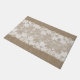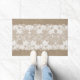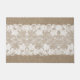Rustic vintage traditional country farmhouse style doormat on beige faux burlap featuring a beautiful white transparent lace with a floral pattern and borders.