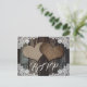 Custom rustic country wedding RSVP postcard with meal selections featuring two burlap hearts on a rustic wood and lace background. Matching items available.