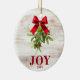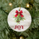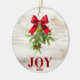 Celebrate the holidays with this elegant rustic Christmas ornament featuring the word JOY in bold red lettering, accented with a sprig of mistletoe tied with a festive red bow. The design sits against a whitewashed wood background for a cosy farmhouse look. Customise with the year to make it a timeless keepsake for your Christmas tree or as a thoughtful gift for family and friends.