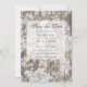 Rustic vintage country style save the date card, featuring weathered grey wood planks with a white floral print. Your details are overlaid on a sheer transparent white square.