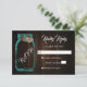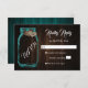 Personalised teal rustic country wood and mason jar wedding RSVP cards featuring a mason jar with two burlap hearts with initials against a rustic wood background. Easily personalise online. Matching items available to complement these cute rustic country wedding RSVP cards. For custom requests, please send us a message.