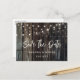 Complement your rustic country wedding party with these save the date postcards featuring string lights on a barn wood background.