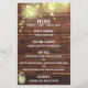Rustic country wedding wood mason jar string of lights tree branch with green leaves wedding menu. 12.5 pt thickness / 110 lb weight paper. The glowing string of lights illuminate the green leaves against a beautiful rustic dark brown wood. This rustic wedding menu design is customisable and perfect for your beautiful outdoor country wedding or western wedding.