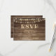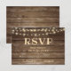 A rustic, country wedding RSVP card with a weathered wood plank background and yellow glow string lights. All text is editable and the font style, size, colour and placement can be changed to accommodate your needs by clicking on the "click to customise further" tab. The back of the invitation features the same wood plank background.