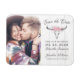 Send this elegant rustic themed wedding save the date photo announcement magnet to family and friends to announce your wedding engagement. The modern boho inspired design template features your photo on the left and to the right is a hand painted cow skull wearing a blush pink watercolor floral headdress on a background of white and grey weathered wood. Above the cow skull it reads "Save the Date" and below is your names and wedding date in black script typography to personalise. Designed by artist Susan Coffey.