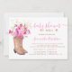 Rustic elegant pink and lavender floral watercolor bouquet and gold glitter confetti on rustic brown watercolor cowboy boots , perfect long distance baby shower by mail with an elegant script font and a little editable mail envelope .