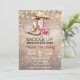 Cute and trendy cowgirl boots birthday invitation for girls. Pink boots with a cowgirl hat with rustic dark wood background and shimmer lights.