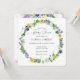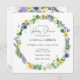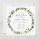 This is a sweet and simple, rustic square baby shower invitation. The design features a wreath made with a variety of spring wildflowers including yellow daffodils, purple pansies, clovers, lavender, sweetpeas, dandelions, tulips and fern and ivy greenery. It also includes a few ladybirds and a sweet dragonfly plus space on the back for additional messaging or a poem.