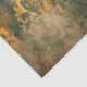 This is an ornate, decorative pattern in shades of gold, turquoise, and rust. The design features intricate, symmetrical damask or arabesque motifs that resemble stylised acanthus leaves, scrolls, and floral elements arranged in vertical columns. The patterns have a distressed, weathered appearance with faded and worn areas, revealing turquoise and rust underneath the gold top layer. This aged patina effect gives the design an antique or vintage feel.