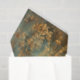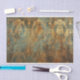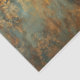 This is an ornate, decorative pattern in shades of gold, turquoise, and rust. The design features intricate, symmetrical damask or arabesque motifs that resemble stylised acanthus leaves, scrolls, and floral elements arranged in vertical columns. The patterns have a distressed, weathered appearance with faded and worn areas, revealing turquoise and rust underneath the gold top layer. This aged patina effect gives the design an antique or vintage feel.