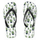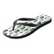 Flip flops with a rustic western flavour. Designed with a bunch of cute green cactuses in a repeating pattern. Specifically, green coloured prickly cactus, in all kinds of shapes and sizes, each sitting in its own dark blue flower pot. Little decorative triangles in between them. Whimsical fun illustration.