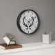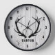 This clock features black deer antlers over a faux wood plank background for a rustic farmhouse look