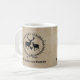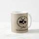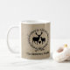 Buck and Doe with a wreath in black over a rustic background. This mug is perfect for cabins, log homes, and anyone that likes a rustic deer look.