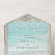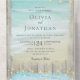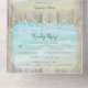 This all-in-one wedding invite includes the invitation and tearaway RSVP, and can be folded and mailed so you don’t need an envelope. Framed with a background of rustic weathered grey wood, beautiful aqua blue ocean waves crash against the beach and string lights decorate the top. These wedding invitations are perfect for destination weddings, as well as any beach and coastal themed wedding.