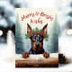 This adorable holiday greeting card features a cute Doberman Pinscher Dog illustration wearing a festive crown wreath of winter florals, holly, pine, and berries, with snowflakes gently falling against a Snowing Forest Winter Scene. The Doberman Pinscher is peeking over the snow-capped log to say hello! The playful text "Merry & Bright Wishes" adds a warm seasonal greeting, and can be customised as you like. The reverse side is decorated with a classic plaid check, adding a traditional touch to the overall design. This cute, playful card is perfect for sending holiday cheer to family and friends, and the customisable name and date make it a personalised keepsake.
