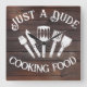 Bring personality and humour to your kitchen or grilling area with this rustic ‘Dude Cooking Food’ wall clock!