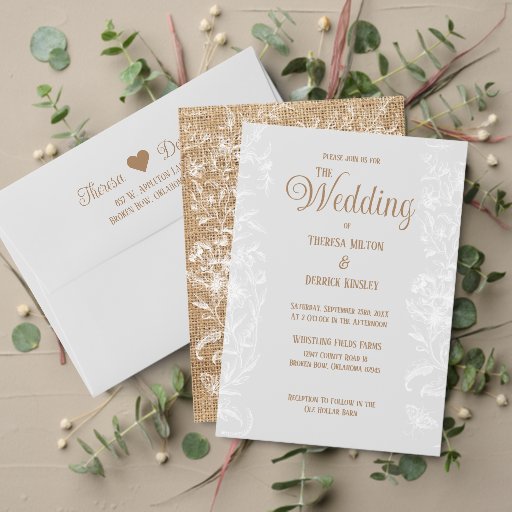 Embrace the rustic allure of a cottage or farmhouse wedding with this beautifully designed invitation featuring a delicate floral lace pattern against a burlap background. The soft dusty blue colour and elegant script typography add a touch of sophistication, perfect for couples seeking a country-inspired wedding theme. Capture the essence of a rustic wedding with our Rustic Burlap and Lace Dusty Blue Wedding Invitation.