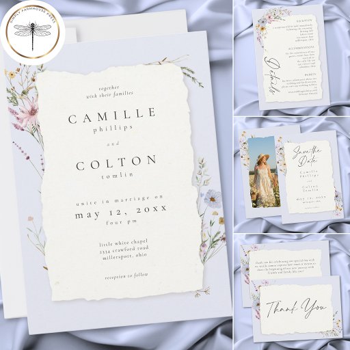 This dusty blue floral wedding details enclosure card features a soft pastel background, delicate wildflowers, and a handmade torn edge paper look. Perfect for romantic garden weddings, it offers an elegant, modern style with timeless charm for couples seeking a refined wedding design. Created by Simply Farmhouse Press.