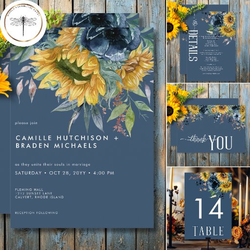 Celebrate the warmth and vibrancy of your love with this stunning sunflower wedding details enclosure card. The vibrant yellow and brown hues of the sunflowers, complemented by the dusty blue poppies and lush green foliage, create a captivating and joyful atmosphere. The dark blue background adds a touch of sophistication, while the clean white font ensures a modern and elegant look. This design is the perfect choice for a summer wedding, capturing the essence of happiness and celebration. Let your guests be drawn into the warmth and beauty of your special day with this stunning design. Created by Simply Farmhouse Press.